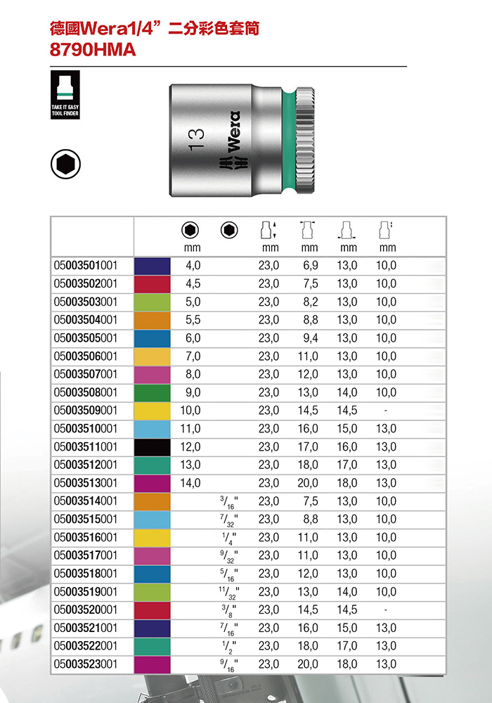 首頁 » 商品資訊 » 德國【Wera】 » Wera 套筒/套筒組 » 德國Wera1/4"二分彩色套筒